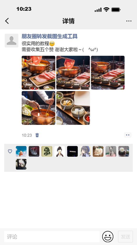 - 填写内容:依次上传头像、输入昵称,填写朋友圈正文,选择配图数量并上传图片,设置发布时间;再根据需要添加点赞头像和评论内容,支持随意调整顺序。