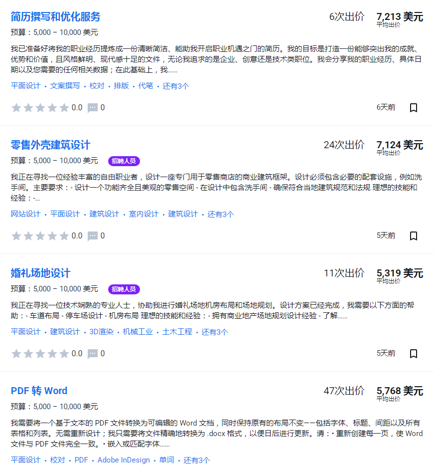 - 佣金标准:固定价 / 小时计费项目抽成 10%(最低 5 美金),竞赛项目抽成 10%,服务类抽成 20%;